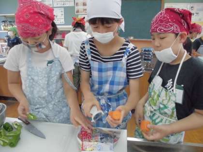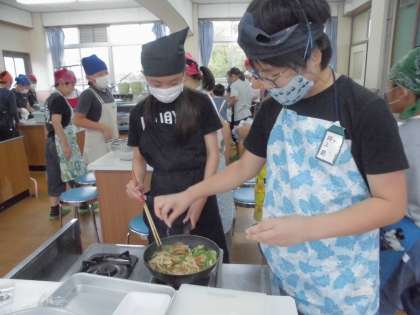 家庭科の授業で調理実習をしました。今回は野菜炒めに挑戦!ピーマン・ハム・にんじん・玉ねぎを使いました。なかでも,玉ねぎは修学旅行に行ったときに玉ねぎほりをして取った淡路島産の玉ねぎを使用。いい匂いが充満していました。