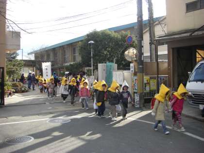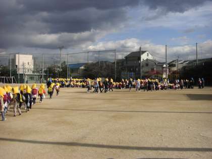 まずは、第一次避難で運動場に集合した後、第二次避難として全校児童が