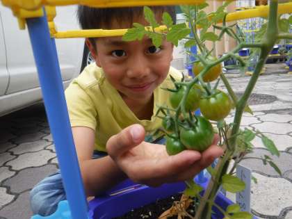 トマトの実の数が増え,大きさも大きくなってきています。ほんのり赤くなり始めたトマトの実もあります。赤くなったトマトの実はおうちに持って帰りますので,ぜひ子どもたちと一緒に食べていただけたらと思います。