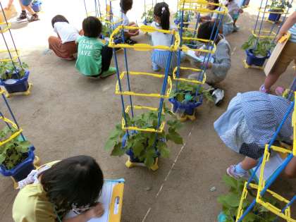 大切に育てているあさがおですが,すくすくと成長しており,前に観察した時と比べて葉っぱも多く,つるも長く成長してきました。子どもたちも毎日水やりをしているおかげで,見に行かなくても自分のあさがおの様子を答えらえるほどになりました。