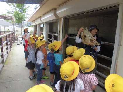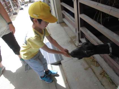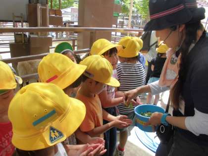 ヤギのえさやり体験をしました。はじめは「恐い」といっている子もいたのですが,おいしそうに食べているヤギを見て,上手にあげることができました。