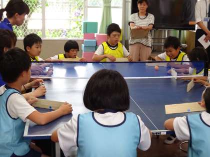 5組のみんなで卓球バレーの学習をしています。卓球のネットや球を使って,バレーボールのようなルールで試合を進めています。