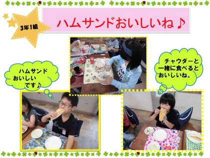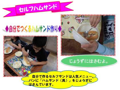 「よし,うまくできた」「見て見て。おいしそうでしょう」と自分で作るハムサンドをおいしそうに食べていました。