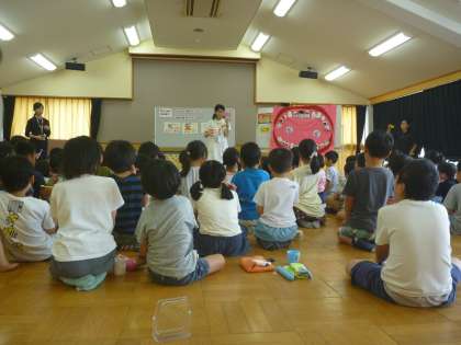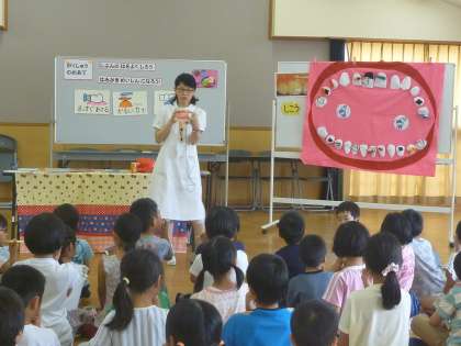 歯ブラシの大きさや持ち方・毛並などを教えてもらい,最後は,「夢をかなえてドラえもん」に合わせて磨く練習をしました。