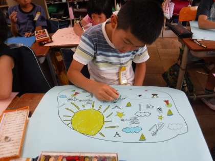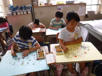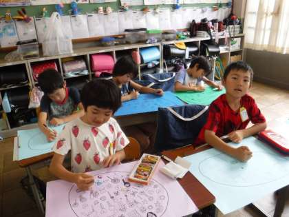 子どもたちは,たまごから何が飛び出してくるのかをイメージしながら,たまごの模様をクレパスで描きました。どれも個性的でかわいらしい作品になりそうです。