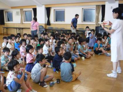 甘いものばかり食べるとぱっくんのような虫歯だらけの歯になってしまうよ。食べたらしっかり歯を磨こうね。今日の給食後はいつも以上に丁寧に歯を磨く子どもたちでした。