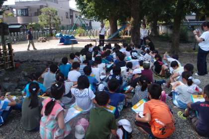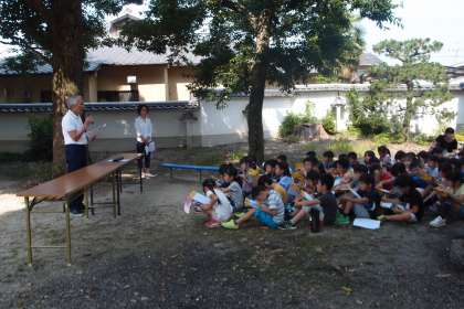 総合的な学習の時間「大好き桂東のまち」の第二弾の見学で,御霊神社に行きました。行き帰りの道中は暑かったですが,御霊神社では大きなご神木「ムクロジ」の木の陰で気持ちよくお話を聞くことができました。神社とお寺の違いや祀られている神様について,行事や地域との関わりなどたくさんのことをお話してくださいました。5月にある子ども祭りなどで御霊神社に行ったことがある人もたくさんいましたが,新しい発見がたくさんあったのではないでしょうか。この見学で学んだことをこれからしっかりとまとめていきたいと思います。