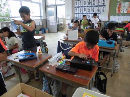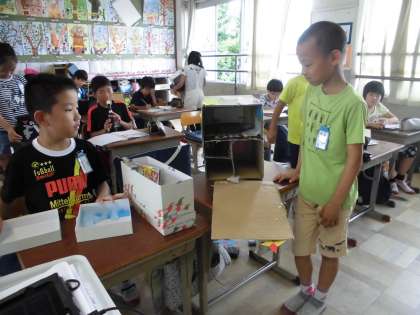 図工科では,「おもしろアイディアボックス」作成中です。中に何を入れるのか考えながら自分の好きな形にしたり,好きなものを付けて飾ったりと楽しんで作ってくれています。何でも入ってしまうくらいの大きさのものからコンパクトですがおしゃれに工夫されたものまで,いろいろと個性豊かなものに仕上げているところです。仕上がりが楽しみです。