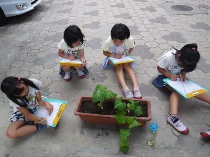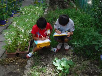 トマトの他に育てている「なす」「きゅうり」「サツマイモ」「オクラ」もどんどん成長しています。なすは,もう実がなっていて食べられそうです。サツマイモは土の中でどんな成長をしているのか見えない分,想像を膨らませ,収穫を楽しみにしています。