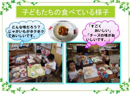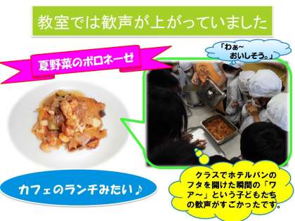今日の給食は新献立の「夏野菜のボロネーゼ」でした。給食運んでいった教室では,フタを開ける瞬間に大きな歓声があちこちで上がっていました。