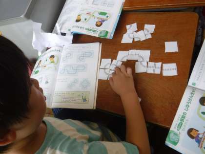 最初は,教科書と同じように作っていた子どもたちでしたが,いつの間にかいろいろな線路ができあがっていきました。そして,「マクドナルドのマークができたよ。」「ミッキーができたよ。」なんて声が聞こえてきました。子どもたちの発想って面白いですね。
