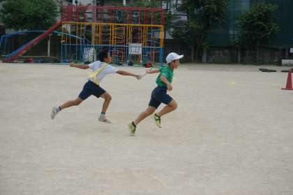 18日に,横浜で行われる日清食品カップの4×100mリレーに出場する6年生はバトンパスの調整をしていました。陸上部では,ブラジル体操をはじめ,動き作りの練習にしっかり取り組んでいます。どの子も陸上競技の楽しさに触れられるように練習を進めていきたいと思います。