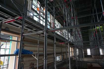 体育館にはアルミサッシが入り,内装工事の準備が進みつつあります。予定では,明日からの学校閉鎖日の間に,屋根にソーラーパネルが置かれるようです。体育館が避難所になり,外部からの電源が止まっても,最低限の電力が確保できる体育館になるようです。