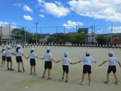 まずは,マイムマイム。音楽に合わせて足のステップと手のたたき方や声の出すところを確認しました。大きな円で迫力あるマイムマイムでした。