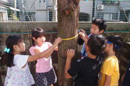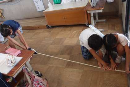 算数の学習で,新しくキロメートルや秒の単位を学習しました。今日は,新しく習った単位を使って,巻尺で,木の周りの長さを計ったり,教室の縦や横の長さを計ったり,ストップウォッチで,運動場1周歩くのに何分かかるかを計ったりしました。