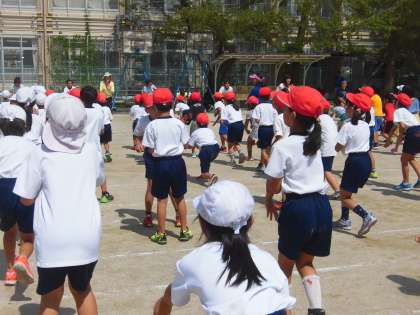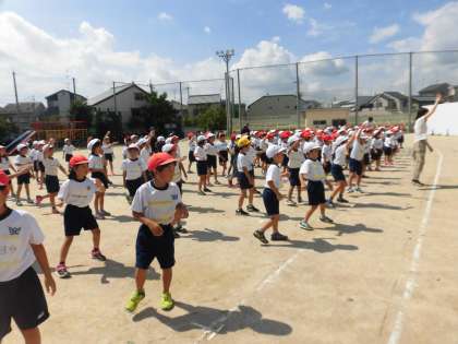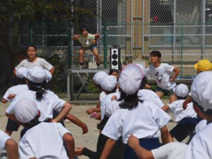 運動会で踊る全校ダンス,「Y.M.C.A」の合同練習の様子です。