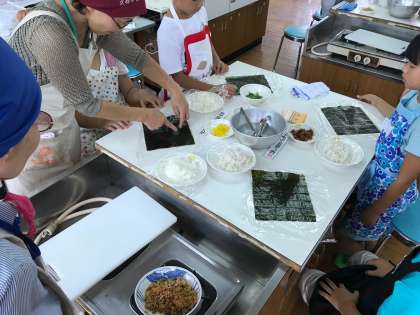 西京食育指導員の方々にお世話になり,3・4年生の児童がおにぎらずを作りました。