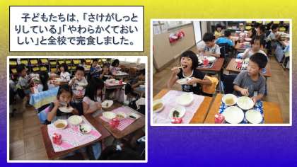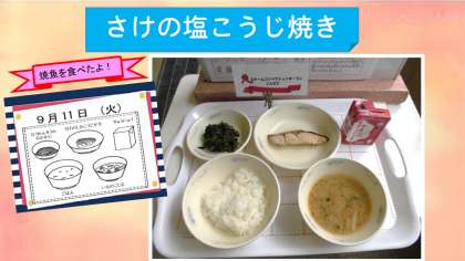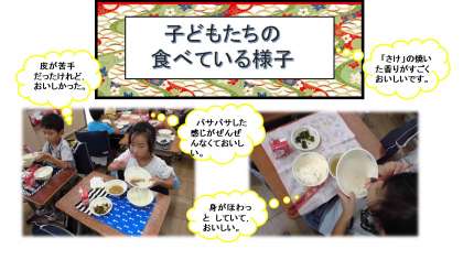 ・いものこ汁 でした。京都市の給食では,「和(なごみ)献立」の日以外でも『一汁二菜』の和食献立が1か月に何回も出てきます。桂東小学校にスチームコンベクションオーブンが導入されて1年が経ち,基準献立を変更して焼魚が登場します。魚の苦手な子ども達も「皮がおいしい」「魚の臭みがなくておいしい」「もっと食べたい」と嬉しい声を給食室にたくさん伝えてくれます。給食に焼魚のバリエーションが増えることで子ども達の魚の苦手意識が少しずつ,なくなってくれればと思います。