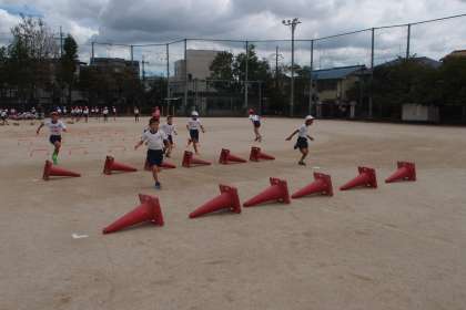 今日はミニハードル走の練習をしました。ミニハードルや倒したコーンなどを跳び越えます。リズムよく跳び越えながら,50mをかけ抜けます。