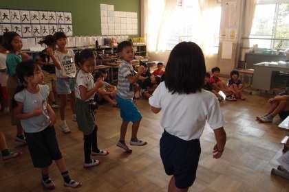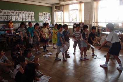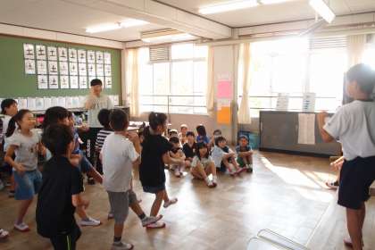 朝学習の時間に各色応援練習をしました。応援団のお兄さんお姉さんが来て,教えてくれました。振りや言葉を覚えて,元気よく声を出せるように本番に向けて練習していきいます。