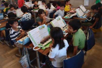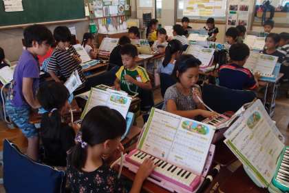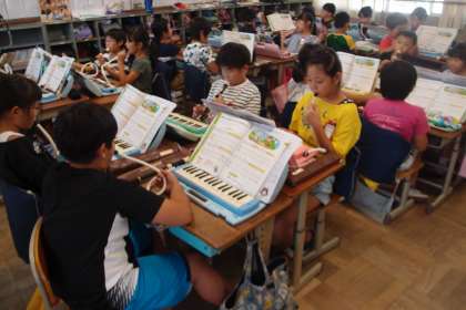音楽では,各班でけんばんハーモニカ1,2とリコーダーの3パートに分かれて合奏の練習をしています。始めはなかなかうまく合いませんでしたが,少しずつ息を合わせられるようになってきました。