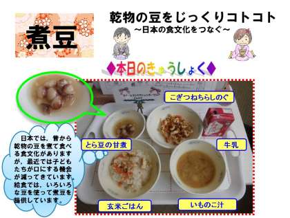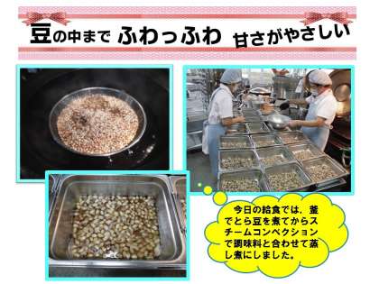 今日の給食は,「玄米ごはん」「牛乳」「こぎつねちらしの具」「とら豆の甘煮」「いものこ汁」でした。スチームコンベクションオーブンで「とら豆の甘煮」を調理しました。