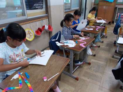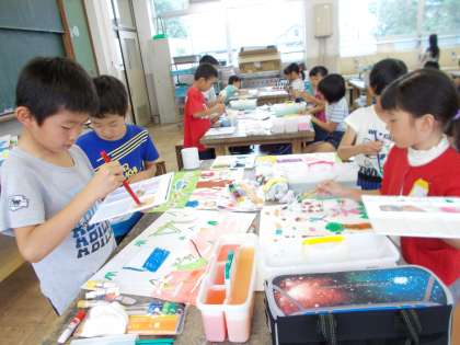 物語を読んで想像したことを絵で表現する,「お話の絵」の学習風景です。
