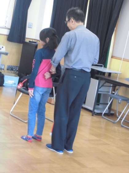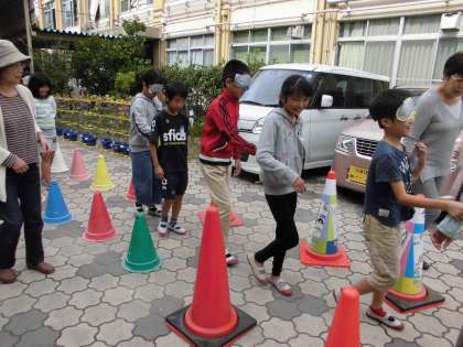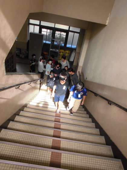 再び,松永さんに来ていただいて,手引のしかたを教えていただきました。外を歩いて階段などの怖い場所に来た時にどう声をかけたらよいのか,一つ一つの説明していただけました。子ども達は,実際に中庭にコーンを立てて歩いたり階段を上り下りしたりして,手引のしかたの難しさや目の見えない怖さを感じたようです。