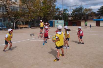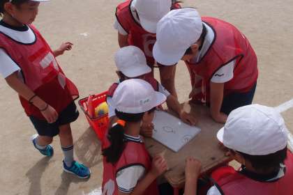 体育の学習では,「ポートボール」を始めました。みんなで協力して準備をしたり,ゲームをしたりしています。勝つためにはどうしたらいいか,チームで話し合い,少しずつチームワークを高めていってほしいと思います。