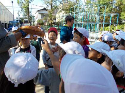 浅原公園は,移動動物園が開催される日で準備をされていて,特別にへびをさわらせてもらいました。つるつるしてぬめっとしていたそうです。