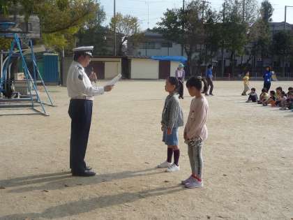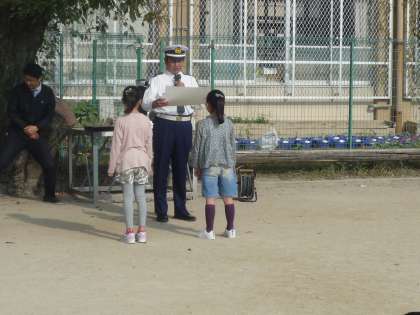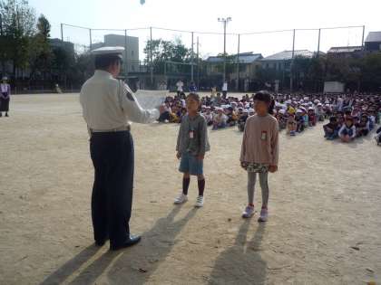 2名の児童が表彰され,来ていただいた西京警察の方から表彰状を授与されました。