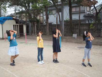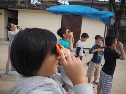 外に出て遮光板を通して太陽を観察しました。太陽を見るという経験に子どもたちは大喜びでした。