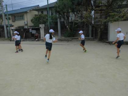 体育科の授業で体ほぐしの運動をしています。走ったり,跳んだりして様々な体の使い方や動かし方を経験しています。