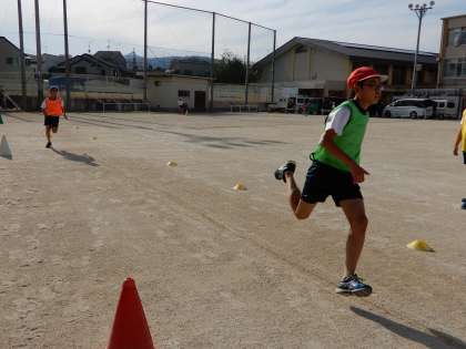 対抗する2チームの勝敗がはっきりするため「競争の楽しさ」がしっかり味わえるとともに,チームタイムの短縮にも挑戦できるので「達成の楽しさ」も味わえ,勝負に負けてもチームタイムを縮める楽しさがあるため,高学年のリレーの学習に向いているのではないかと考えています。