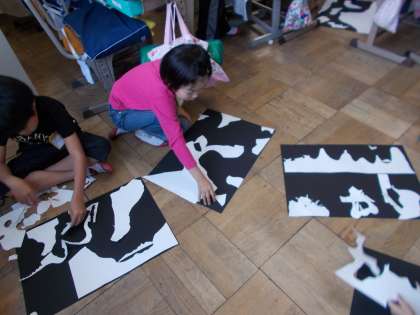 まず,はさみで白い画用紙をおもしろいと思う形に切っていきました。そして,想像を膨らませながら黒い画用紙の上にのせていきました。子どもたちは「先生何に見える?」とか「これ怪獣みたい。」などなど話をしながら楽しんで活動していました。