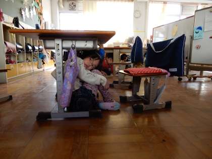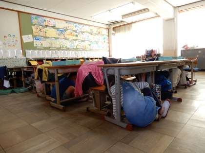 本校でも,午前10時に緊急地震速報を流し,シェイクアウト訓練を行いました。子ども達は,緊急地震速報の後,担任の指示で机の下に体を隠す1次避難に取組みました。