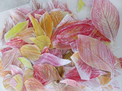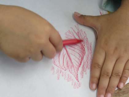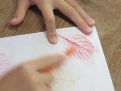 お気に入りの葉を1枚拾い,薄い紙の下に敷いてクーピーでこすりだしました。