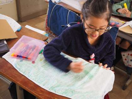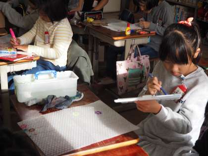 図工「これにえがいたら」では,プチプチシートや布,段ボールなどに,それぞれの特徴を生かして,絵を描きました。紙とは違う素材にわくわくしながら思い思いに描き,素敵な作品に仕上がりました。