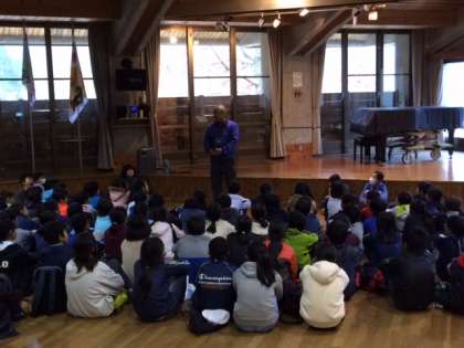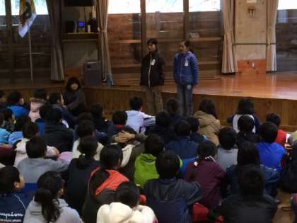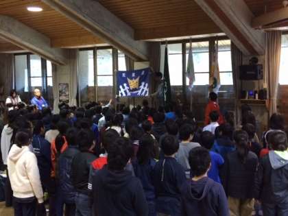 小雨が降っているので、入所式は山の家の中ですることになりました。きれいな歌声で校歌を歌いました。