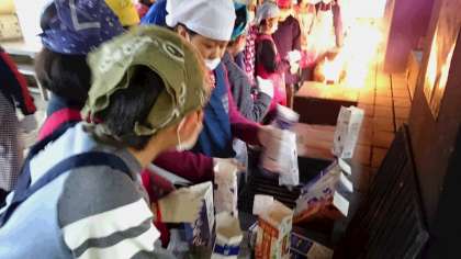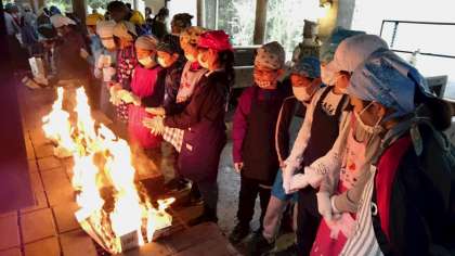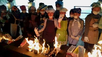調理できたら、牛乳パックにパンを入れて火を付けます。