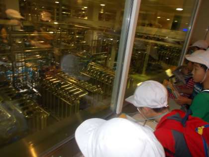 工場の中には大きな機械がたくさんありました。人はほとんどおらず,ビール造りのたくさんの工程を機械で行っていました。でも,中には人が働いている場面もあり,おいしいビールがしっかりと造られているか確認していました。