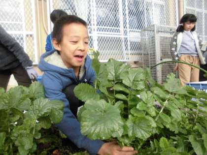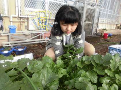 畑で種から育てた大根が大きく成長し,いよいよ収穫の時になりました。今日は雨もあがり,晴れ間の元で収穫できる喜びをみんな味わっていました。たくさん付いた葉をかき分けて根本を探すことに苦労しながらも,「よいしょ!」「うわぁ!抜けた!」と,声を出しながら抜くことができました。