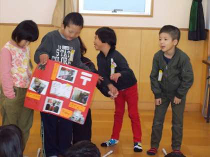 毎回恒例のハッピーバースデーの歌の後,5組の町たんけん「ゆうびんきょく」の発表がありました。ポスターでの発表とクイズがありました。郵便局の秘密も知れてうれしそうでした。