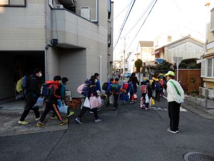 子ども達は,桂東見守り隊の皆さんとPTAの旗持ち当番の保護者の皆さんに見守られて久しぶりの集団登校です。