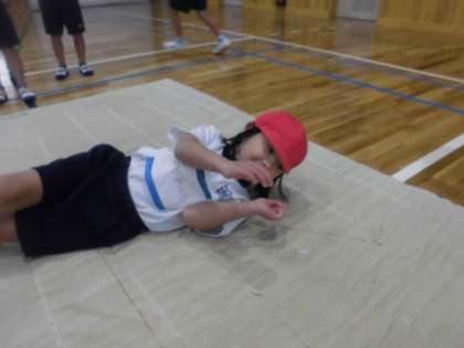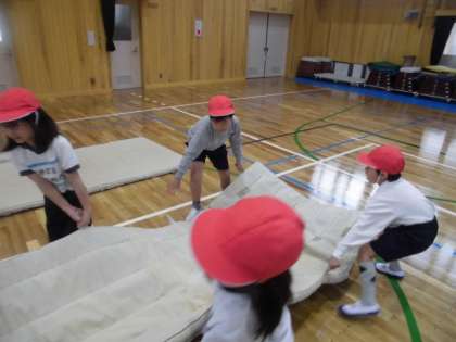 新しくなった体育館で体育がありました。「木のにおいがするね。」とピカピカ光る床や壁を眺めていた子どもたち。少し肌寒い体育館の空気を感じながら,マットあそびを行いました。足元には,これまた新しい青靴も光り,みんなやる気満々で頑張りました。