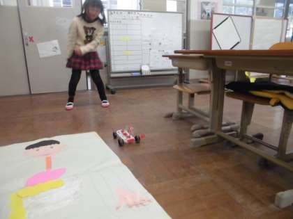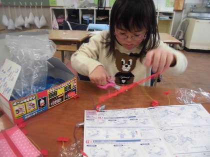 電池を使って豆電球をつける復習をし,今日はモーターをつないで車が走り出すところまでを学習しました。導線をつないだり,スイッチをつなげたりと細かな工程がいくつもありましたが,「これここ?」「こっちはつける?」など,説明をよく聞いて一つひとつ丁寧に仕上げていました。いざモーターが周り車が動き出すと,「わぁ!!」と,とっても喜んで何度も動かして楽しみました。