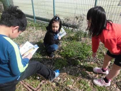 日中の日差しが暖かい日もあったり,まだまだ寒い日があったりしますが,この日はとても気持ちのよい日差しの下,春見つけに行きました。校内にある春はどこにあるかな?とみんなで探していると,「あった!見てみて!」とさっそくタンポポや桜の芽が膨らんでいる様子を見つけていました。春もすぐそこまできていることに嬉しくなる時間でした。