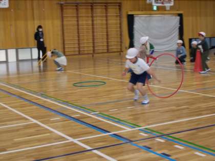 みんなで「ヒカレ」を歌った後,障害物リレーを行いました。どのチームも必死に応援し,フラフープをくぐったり,ドリブルしたりするのを楽しんでいました。笑顔いっぱいのお誕生日会になりました。