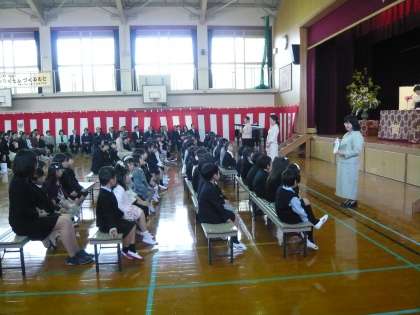 桂東小学校の名札をつけた87名のぴかぴかの1年生が入場し,会場から祝福の拍手を受けました。学校長のあいさつ,来賓のPTA会長のあいさつの後,2年生の児童から学校紹介がありました。