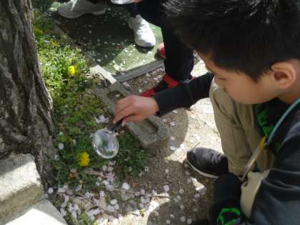 3年生から始まった理科の学習。楽しみにしていた子どもたちも多かったです。この日は外に出て,春に咲く花や生き物を観察しました。子どもたちはダンゴ虫を見つけては大喜びし,虫めがねでじっくり観察していました。
